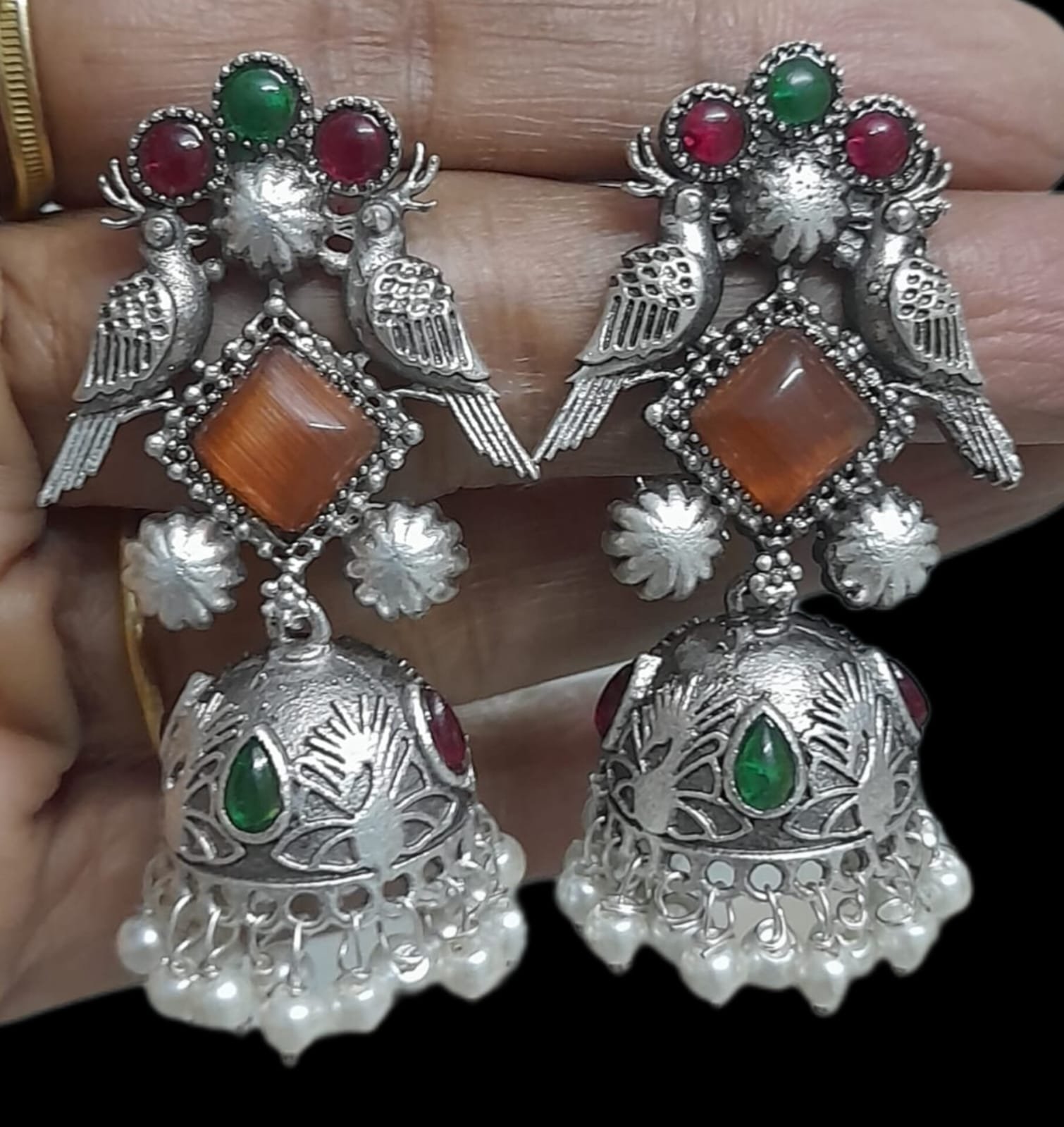 These stunning antique oxidised silver-tone Jhumka earrings embody traditional Indian craftsmanship with a rich, vintage appeal. The intricate design is centered around a ‘Mayura’ (peacock/bird) motif in the stud section, often featuring pairs of birds flanking a central square or diamond-shaped semi-precious stone (in the picture, an orange/amber colored stone).
