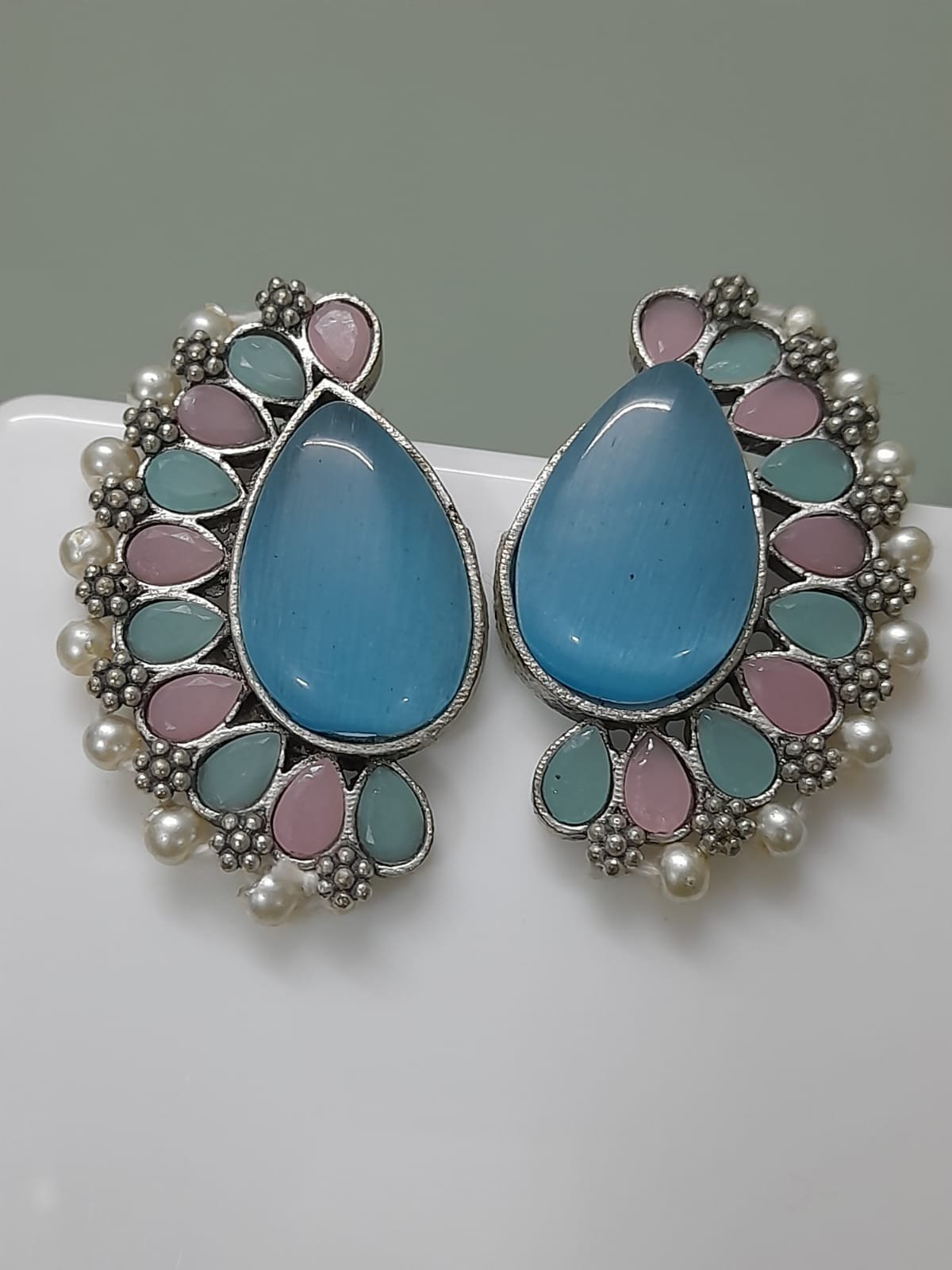 Add a soft touch of elegance to your look with these stunning pastel teardrop earrings. Featuring a large mint-green stone at the center, surrounded by delicate pink and aqua drops, these earrings are enhanced with antique silver floral accents and tiny pearl borders. The intricate craftsmanship and soothing color palette make them perfect for festive occasions, parties, or casual ethnic wear.