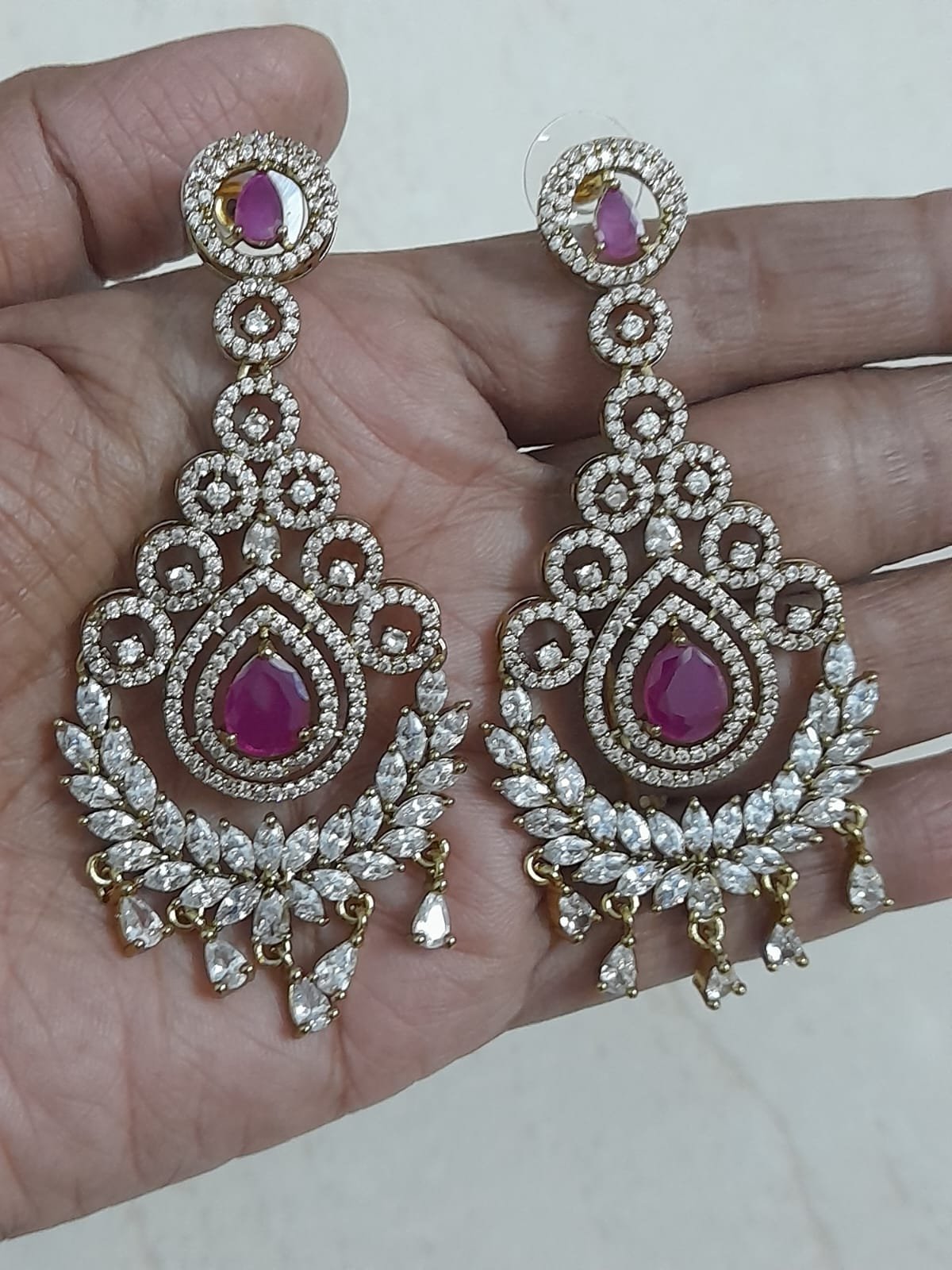 Make an unforgettable statement with these grand chandelier earrings. The design features brilliant White AD (American Diamond) stones framing a striking ruby red central teardrop AD stone, set in a classic Mehndi Polish (Copper-tone) finish. The intricate, tiered Jhoomer design is edged with glittering AD marquise-cut stones and finished with delicate crystal drops, creating a stunning sweep of sparkle. These luxurious earrings offer a perfect blend of traditional Indian artistry and modern glamour, making them the ultimate accessory for bridal events, grand functions, and festive celebrations.